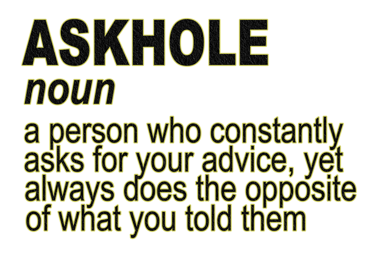 Highlights • Ships from Washington! Shorter shipping distances are kinder to the planet • Free shipping Materials: eco solvent ink, premium outdoor grade vinyl This is for one (1) 4 x 2.74 inch die cut vinyl waterproof sticker. Sticker decal: A black & white picture of a sign that reads "Askehole" with a definition underneath stating "A person who consistently asks for your advice, yet never does what you told them". The artwork is simple and uses shades of gray to convey its message. Sticker decal is indoor and outdoor (UV) safe. These high quality decal stickers are thick and durable and can be used many ways and on many items such as car windows, walls, lockers, tumblers, wine glasses, notebooks, planners, mirrors, cellphone cases, and more. Makes a great gift! Funny waterproof sticker - weatherproof bumper sticker - vinyl decal