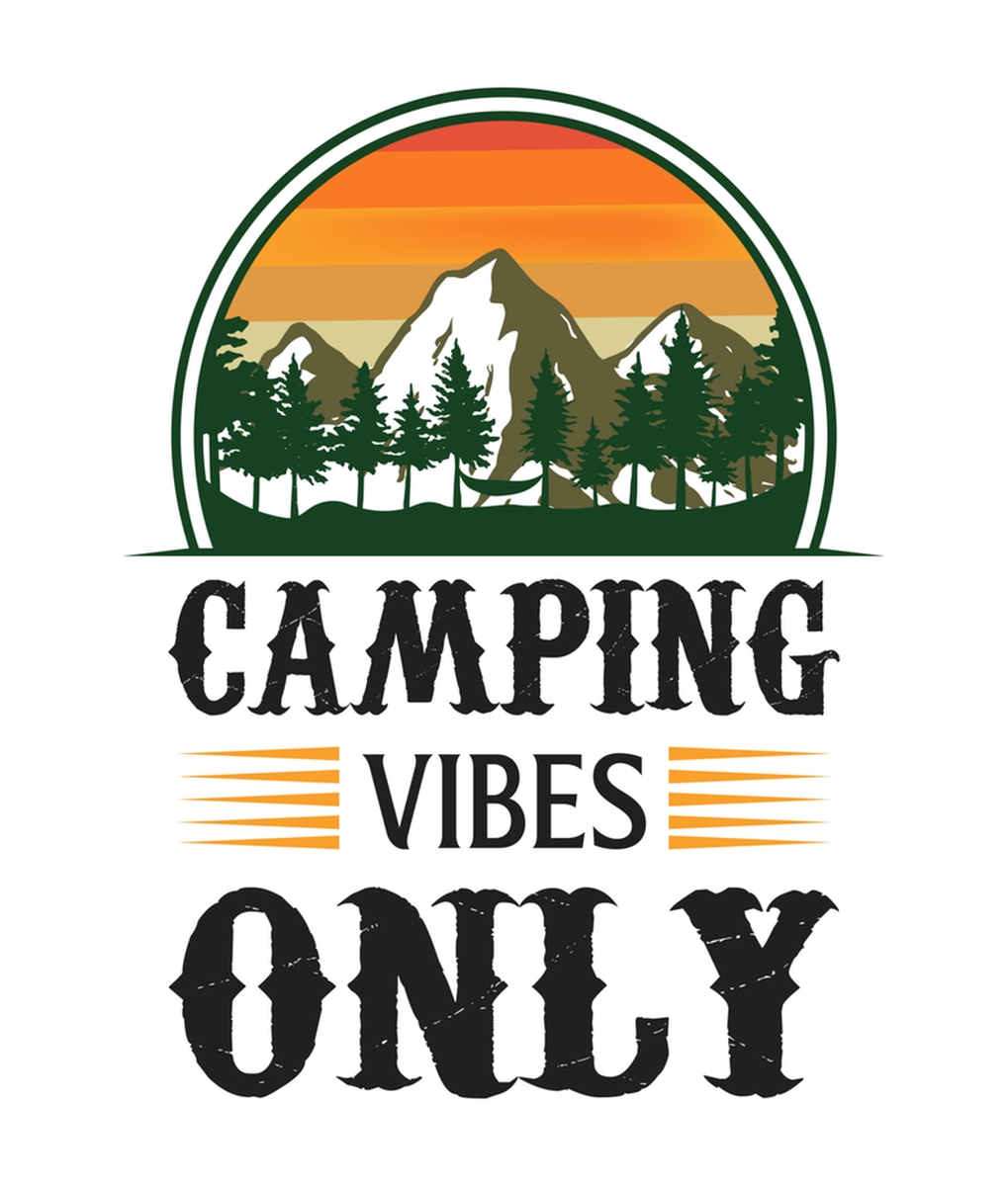 Highlights • Ships from Washington! Shorter shipping distances are kinder to the planet • Free shipping Materials: eco solvent ink, premium outdoor grade vinyl This is for one (1) 3.4 x 4 inch die cut vinyl waterproof sticker. Sticker decal featuring a camping themed logo with a mountain range silhouette in a sunset sky, text reading "CAMPING VIBES ONLY," and an illustrated pine tree on a landscape background. The overall style is cartoonish with a vintage look. Sticker decal is indoor and outdoor (UV) safe. These high quality decal stickers are thick and durable and can be used many ways and on many items such as car windows, walls, lockers, tumblers, wine glasses, notebooks, planners, mirrors, cellphone cases, and more. Makes a great gift! Funny waterproof sticker - weatherproof bumper sticker - vinyl decal