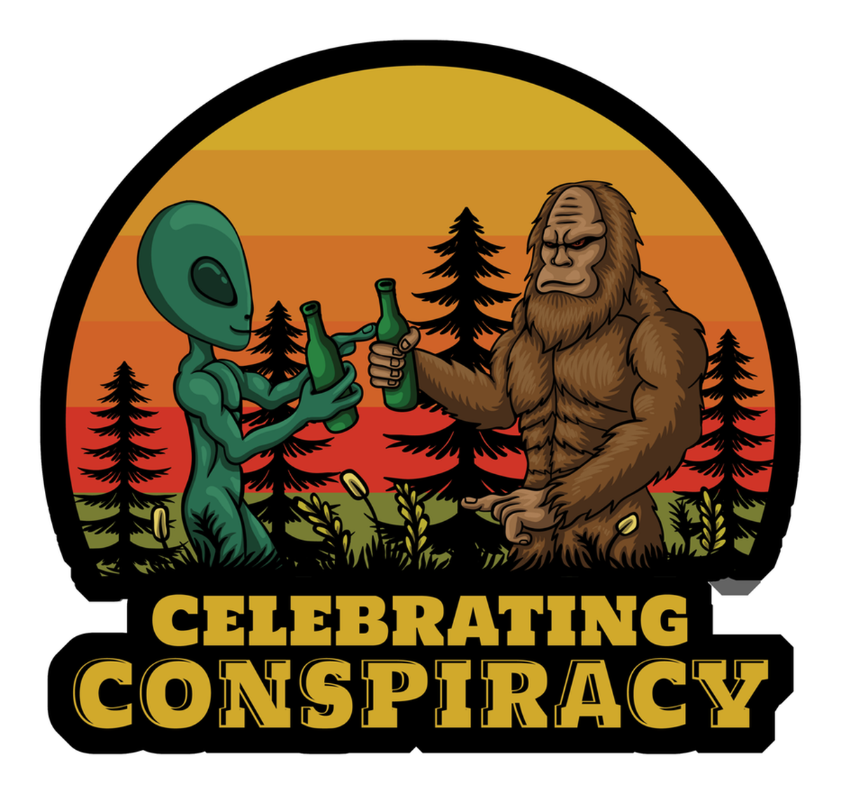 Highlights • Ships from Washington! Shorter shipping distances are kinder to the planet • Free shipping Materials: eco solvent ink, premium outdoor grade vinyl This is for one (1) 4 x 3.77 inch die cut vinyl waterproof sticker. Sticker decal featuring a cartoon depiction of an alien and human high-fiving over beers in front of a sunset, with trees and a cabin in the background, celebrating 'CONSPIRACY' with text at top. Sticker decal is indoor and outdoor (UV) safe. These high quality decal stickers are thick and durable and can be used many ways and on many items such as car windows, walls, lockers, tumblers, wine glasses, notebooks, planners, mirrors, cellphone cases, and more. Makes a great gift! Funny waterproof sticker - weatherproof bumper sticker - vinyl decal