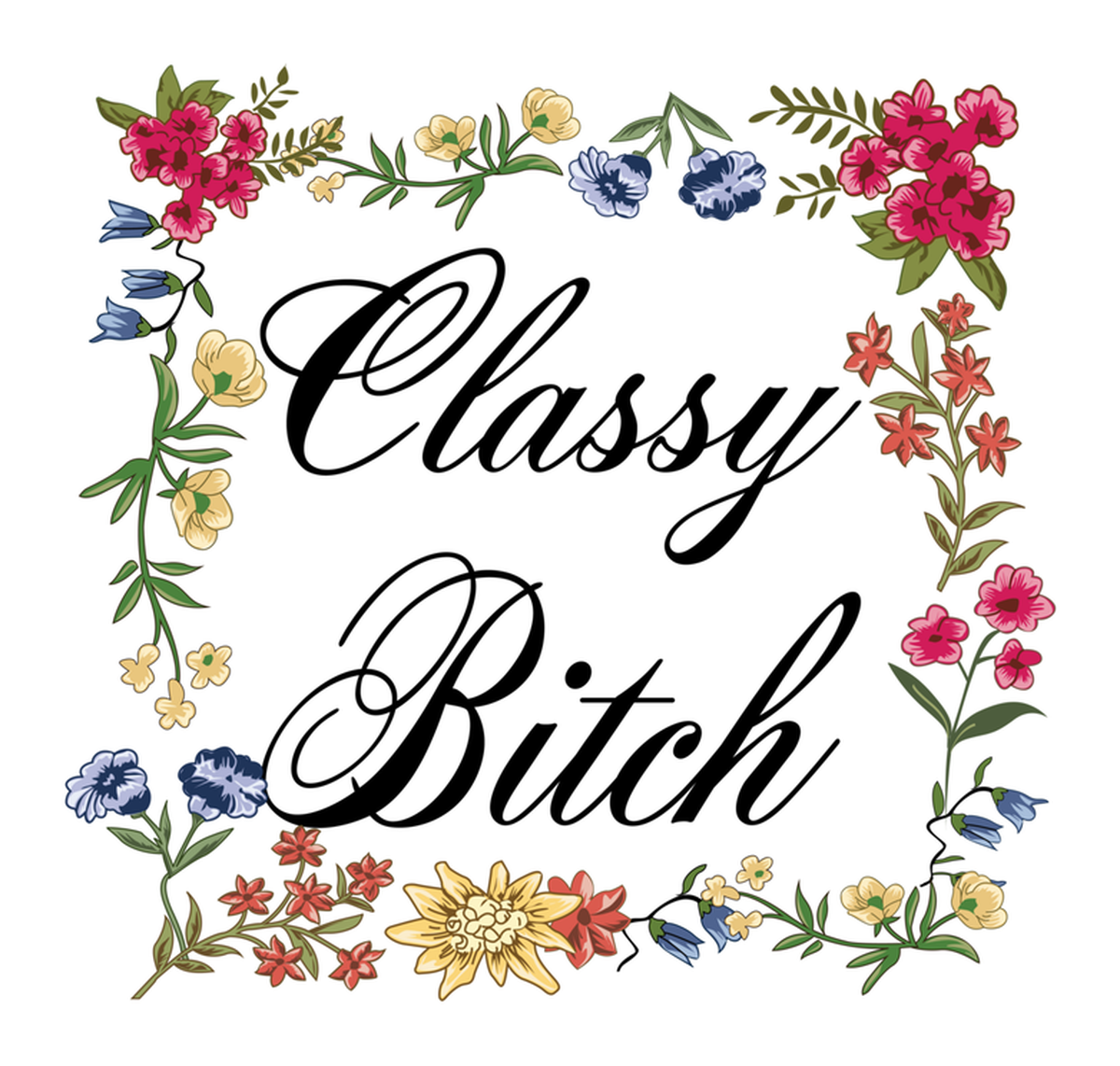 Highlights • Ships from Washington! Shorter shipping distances are kinder to the planet • Free shipping Materials: eco solvent ink, premium outdoor grade vinyl This is for one (1) 4 x 3.81 inch die cut vinyl waterproof sticker. Sticker decal: "Classy bitch" written on border with floral motif, featuring shades of red, blue, green, yellow, and purple flowers on white background. Sticker decal is indoor and outdoor (UV) safe. These high quality decal stickers are thick and durable and can be used many ways and on many items such as car windows, walls, lockers, tumblers, wine glasses, notebooks, planners, mirrors, cellphone cases, and more. Makes a great gift! Funny waterproof sticker - weatherproof bumper sticker - vinyl decal