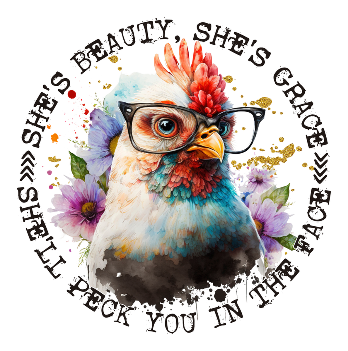 Highlights • Ships from Washington! Shorter shipping distances are kinder to the planet • Free shipping Materials: eco solvent ink, premium outdoor grade vinyl This is for one (1) 3.96 x 4 inch die cut vinyl waterproof sticker. Sticker decal features a stylized rooster character with a humorous expression wearing glasses, holding a beauty salon sign. It is surrounded by colorful flowers in an ornate pattern with the text "She's beautiful she's grace she's got great taste. Sticker decal is indoor and outdoor (UV) safe. These high quality decal stickers are thick and durable and can be used many ways and on many items such as car windows, walls, lockers, tumblers, wine glasses, notebooks, planners, mirrors, cellphone cases, and more. Makes a great gift! Funny waterproof sticker - weatherproof bumper sticker - vinyl decal