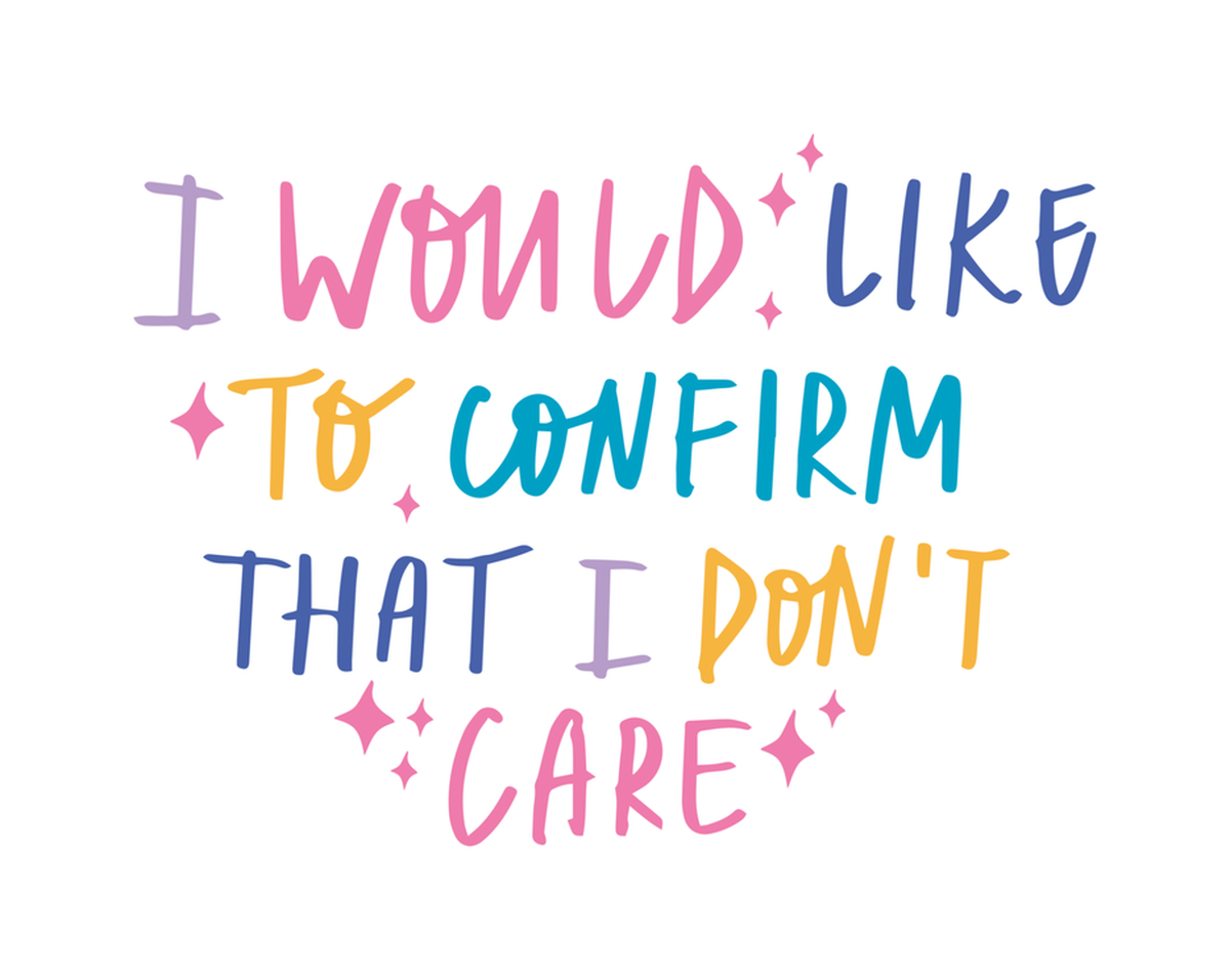 Highlights • Ships from Washington! Shorter shipping distances are kinder to the planet • Free shipping Materials: eco solvent ink, premium outdoor grade vinyl This is for one (1) 4 x 3.19 inch die cut vinyl waterproof sticker. Sticker decal: "I would like to confirm that I don't care" written in handwritten style fonts, featuring pink, blue, green, purple and yellow colors. Sticker decal is indoor and outdoor (UV) safe. These high quality decal stickers are thick and durable and can be used many ways and on many items such as car windows, walls, lockers, tumblers, wine glasses, notebooks, planners, mirrors, cellphone cases, and more. Makes a great gift! Funny waterproof sticker - weatherproof bumper sticker - vinyl decal