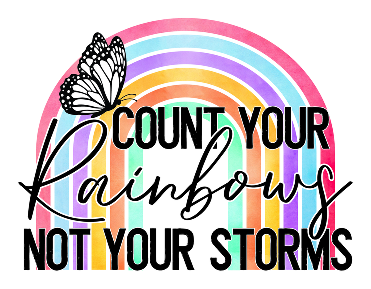 Highlights • Ships from Washington! Shorter shipping distances are kinder to the planet • Free shipping Materials: eco solvent ink, premium outdoor grade vinyl This is for one (1) 4 x 3.12 inch die cut vinyl waterproof sticker. Sticker decal depicts a vibrant rainbow with an illustration of a butterfly on the left side, surrounded by text that reads "COUNT YOUR RAINBOWS. NOT YOUR STORMS." in a white cursive font. Sticker decal is indoor and outdoor (UV) safe. These high quality decal stickers are thick and durable and can be used many ways and on many items such as car windows, walls, lockers, tumblers, wine glasses, notebooks, planners, mirrors, cellphone cases, and more. Makes a great gift! Funny waterproof sticker - weatherproof bumper sticker - vinyl decal