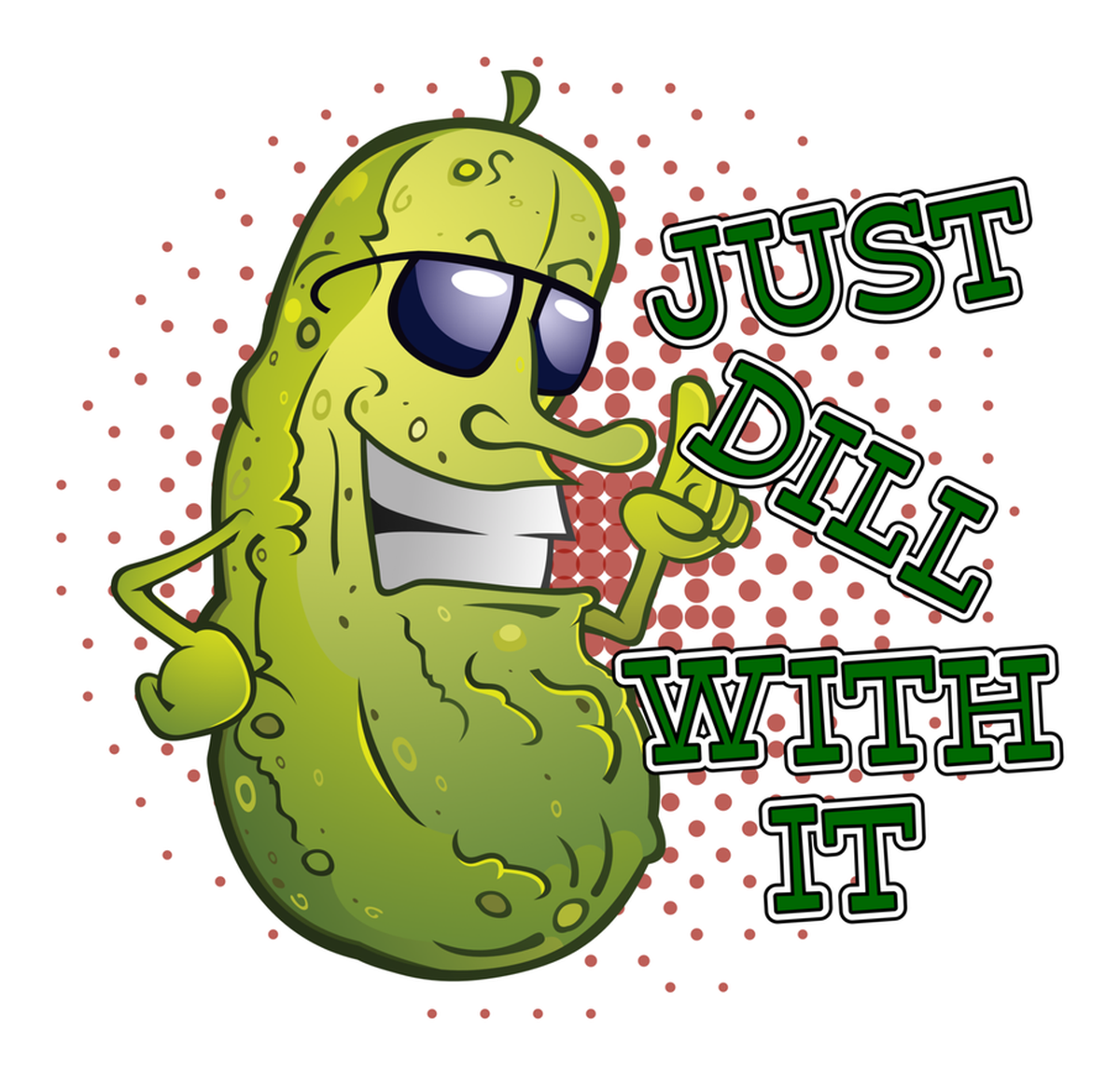 Highlights • Ships from Washington! Shorter shipping distances are kinder to the planet • Free shipping Materials: eco solvent ink, premium outdoor grade vinyl This is for one (1) 4 x 3.84 inch die cut vinyl waterproof sticker. Sticker decal: A pickle cartoon with sunglasses, wearing a t-shirt, holding a sign that says "Just Dill With It" in front of a background filled with red speckles. Sticker decal is indoor and outdoor (UV) safe. These high quality decal stickers are thick and durable and can be used many ways and on many items such as car windows, walls, lockers, tumblers, wine glasses, notebooks, planners, mirrors, cellphone cases, and more. Makes a great gift! Funny waterproof sticker - weatherproof bumper sticker - vinyl decal