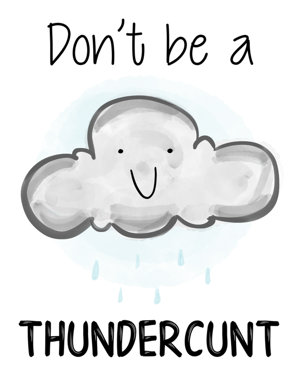 Highlights • Ships from Washington! Shorter shipping distances are kinder to the planet • Free shipping Materials: eco solvent ink, premium outdoor grade vinyl This is for one (1) 3.23 x 4 inch die cut vinyl waterproof sticker. Sticker decal: Drawing of a cartoon thunderstorm cloud with raindrops, featuring a hand-drawn illustration of a cloud with a face. Black and white line drawing. The text is 'don't be a thunder cunt'. Sticker decal is indoor and outdoor (UV) safe. These high quality decal stickers are thick and durable and can be used many ways and on many items such as car windows, walls, lockers, tumblers, wine glasses, notebooks, planners, mirrors, cellphone cases, and more. Makes a great gift! Funny waterproof sticker - weatherproof bumper sticker - vinyl decal
