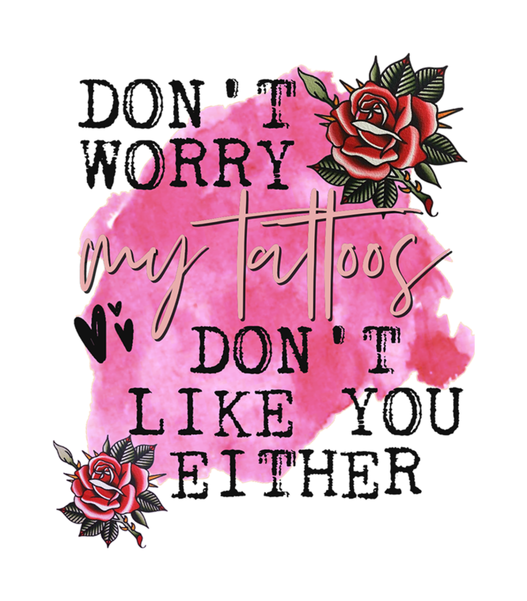 Highlights • Ships from Washington! Shorter shipping distances are kinder to the planet • Free shipping Materials: eco solvent ink, premium outdoor grade vinyl This is for one (1) 3.51 x 4 inch die cut vinyl waterproof sticker. Sticker decal: "Don't worry my tattoos, I don't like you either Sticker decal is indoor and outdoor (UV) safe. These high quality decal stickers are thick and durable and can be used many ways and on many items such as car windows, walls, lockers, tumblers, wine glasses, notebooks, planners, mirrors, cellphone cases, and more. Makes a great gift! Funny waterproof sticker - weatherproof bumper sticker - vinyl decal