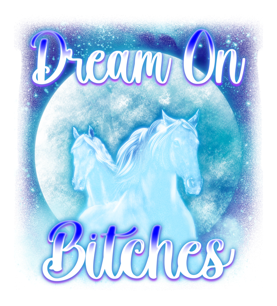 Highlights • Ships from Washington! Shorter shipping distances are kinder to the planet • Free shipping Materials: eco solvent ink, premium outdoor grade vinyl This is for one (1) 3.63 x 4 inch die cut vinyl waterproof sticker. Sticker decal featuring a digital art of two horses against a moonlit sky with the text "Dream on Bitches" overlaid in white cursive lettering. The style is vibrant, colorful with a blue background. Sticker decal is indoor and outdoor (UV) safe. These high quality decal stickers are thick and durable and can be used many ways and on many items such as car windows, walls, lockers, tumblers, wine glasses, notebooks, planners, mirrors, cellphone cases, and more. Makes a great gift! Funny waterproof sticker - weatherproof bumper sticker - vinyl decal