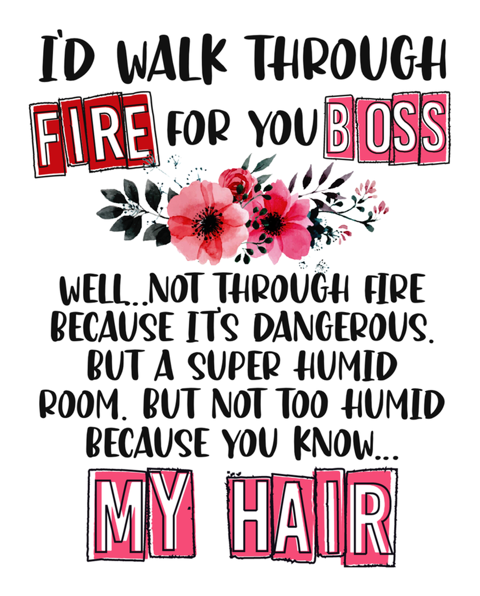 Highlights • Ships from Washington! Shorter shipping distances are kinder to the planet • Free shipping Materials: eco solvent ink, premium outdoor grade vinyl This is for one (1) 3.22 x 4 inch die cut vinyl waterproof sticker. Sticker decal: A black and white illustration with a quote "I'd walk through fire for you boss" on top, featuring red flowers, text "well not through fire because its dangerous but a super humid room...but not too humid because you know what my hair looks like." at the bottom. Sticker decal is indoor and outdoor (UV) safe. These high quality decal stickers are thick and durable and can be used many ways and on many items such as car windows, walls, lockers, tumblers, wine glasses, notebooks, planners, mirrors, cellphone cases, and more. Makes a great gift! Funny waterproof sticker - weatherproof bumper sticker - vinyl decal