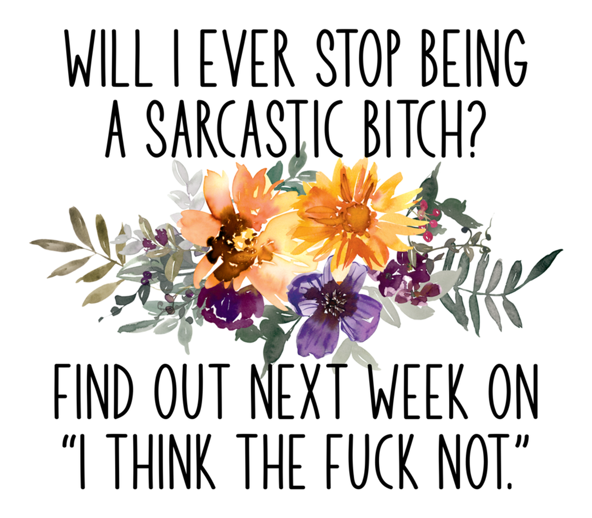 Highlights • Ships from Washington! Shorter shipping distances are kinder to the planet • Free shipping Materials: eco solvent ink, premium outdoor grade vinyl This is for one (1) 4 x 3.5 inch die cut vinyl waterproof sticker. Sticker decal of a flowery bouquet reading "will I ever stop being a sarcastic bitch??" accompanied by a drawing of a person with a speech bubble saying "I think not. Sticker decal is indoor and outdoor (UV) safe. These high quality decal stickers are thick and durable and can be used many ways and on many items such as car windows, walls, lockers, tumblers, wine glasses, notebooks, planners, mirrors, cellphone cases, and more. Makes a great gift! Funny waterproof sticker - weatherproof bumper sticker - vinyl decal