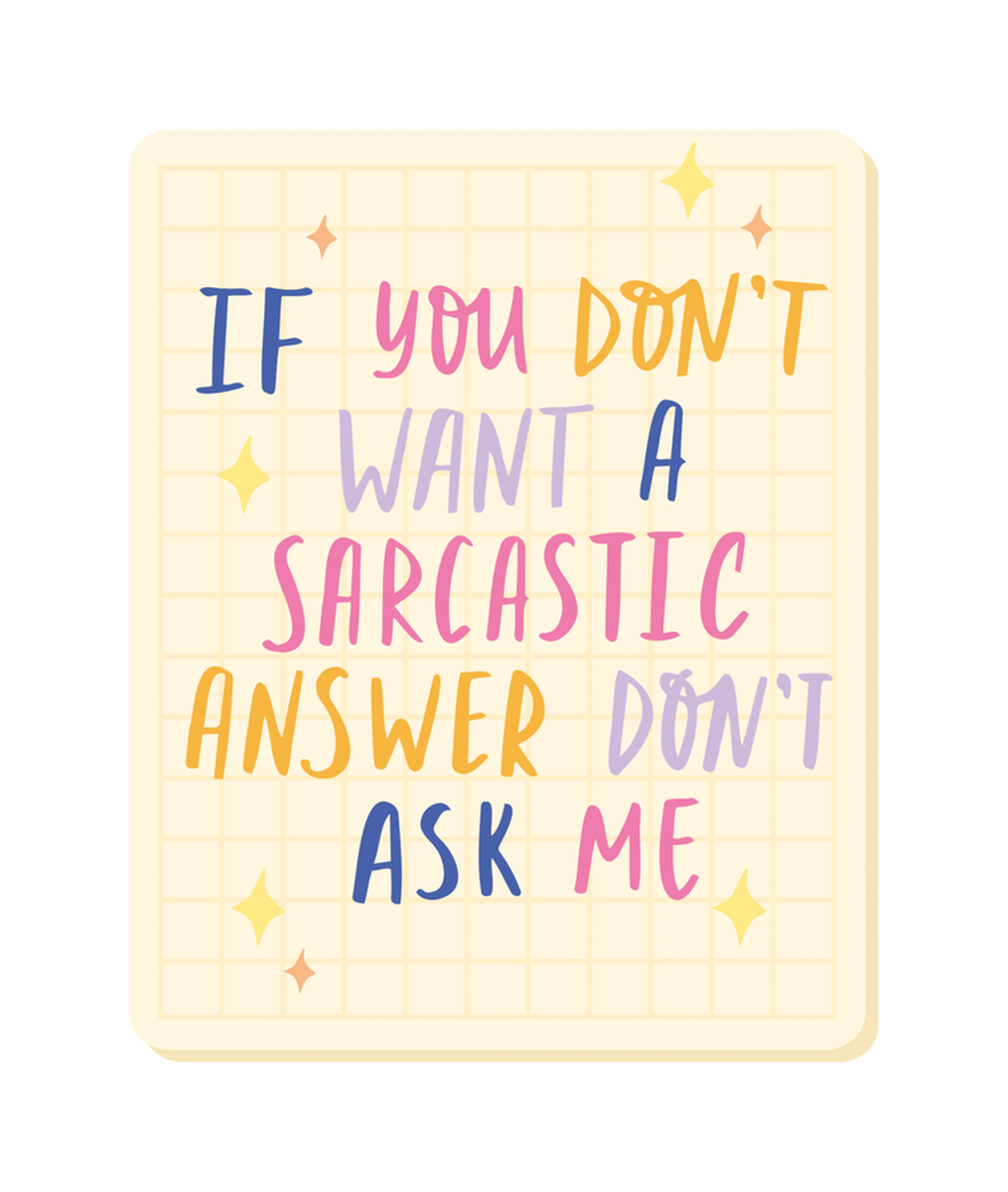 Highlights • Ships from Washington! Shorter shipping distances are kinder to the planet • Free shipping Materials: eco solvent ink, premium outdoor grade vinyl This is for one (1) 3.38 x 4 inch die cut vinyl waterproof sticker. Sticker decal: A white square with a cartoon speech bubble, featuring an image of a notebook and a pen, with the text "If you don't want a sarcastic answer, DON'T ask me" in colorful letters, displayed on the left side of the square. Sticker decal is indoor and outdoor (UV) safe. These high quality decal stickers are thick and durable and can be used many ways and on many items such as car windows, walls, lockers, tumblers, wine glasses, notebooks, planners, mirrors, cellphone cases, and more. Makes a great gift! Funny waterproof sticker - weatherproof bumper sticker - vinyl decal