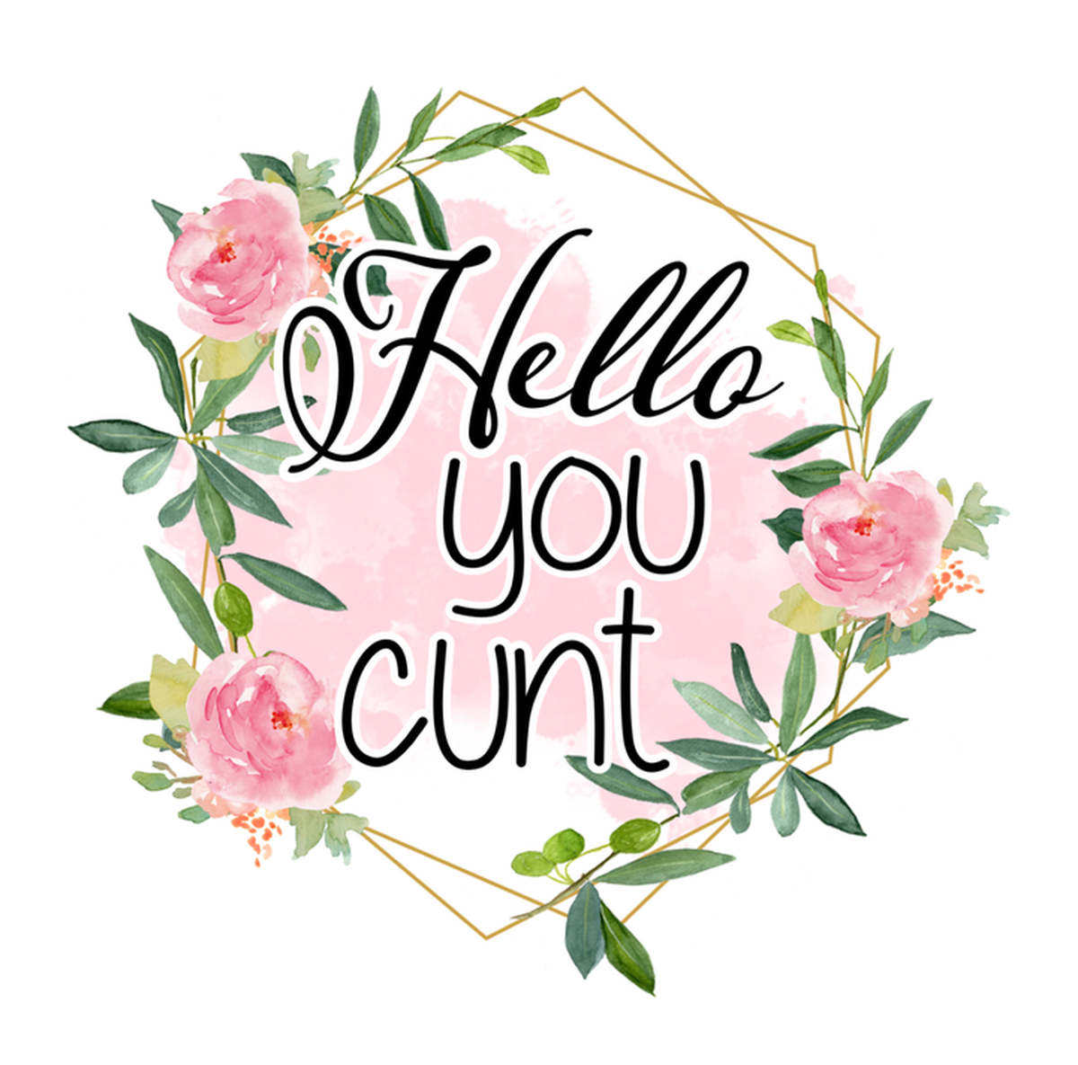 Highlights • Ships from Washington! Shorter shipping distances are kinder to the planet • Free shipping Materials: eco solvent ink, premium outdoor grade vinyl This is for one (1) 4 x 3.95 inch die cut vinyl waterproof sticker. Sticker decal featuring a floral border around the phrase "HELLO YOU CUNT" with a pink rose design, handwritten in a casual script, set against a black background. Sticker decal is indoor and outdoor (UV) safe. These high quality decal stickers are thick and durable and can be used many ways and on many items such as car windows, walls, lockers, tumblers, wine glasses, notebooks, planners, mirrors, cellphone cases, and more. Makes a great gift! Funny waterproof sticker - weatherproof bumper sticker - vinyl decal
