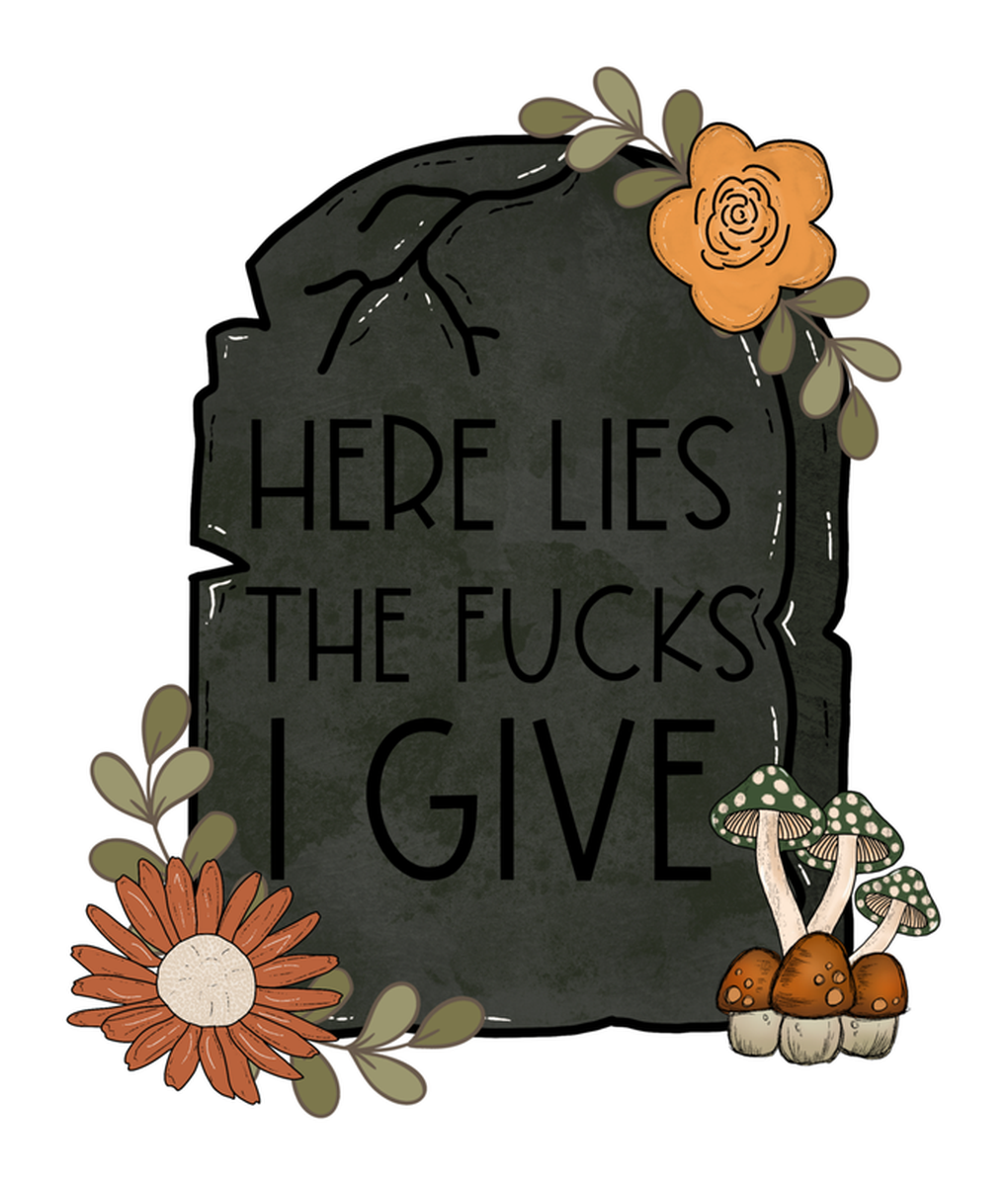 Highlights • Ships from Washington! Shorter shipping distances are kinder to the planet • Free shipping Materials: eco solvent ink, premium outdoor grade vinyl This is for one (1) 3.4 x 4 inch die cut vinyl waterproof sticker. Sticker decal: A cartoon-style illustration of a black gravestone with flowers and mushrooms on top, featuring a hand-drawn quote in white text that says "Here lies the Fucks I give, I GIVE. Sticker decal is indoor and outdoor (UV) safe. These high quality decal stickers are thick and durable and can be used many ways and on many items such as car windows, walls, lockers, tumblers, wine glasses, notebooks, planners, mirrors, cellphone cases, and more. Makes a great gift! Funny waterproof sticker - weatherproof bumper sticker - vinyl decal