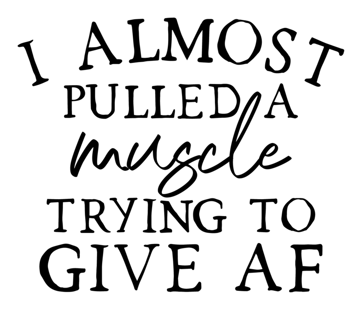 Highlights • Ships from Washington! Shorter shipping distances are kinder to the planet • Free shipping Materials: eco solvent ink, premium outdoor grade vinyl This is for one (1) 4 x 3.43 inch die cut vinyl waterproof sticker. Sticker decal: Text-based artwork featuring a black font on a white background that reads "I almost pulled a muscle trying to give AF," with the text outlined by a black outline. The sticker appears to be humorous and is used to express a personal experience of exertion while trying to do something. Sticker decal is indoor and outdoor (UV) safe. These high quality decal stickers are thick and durable and can be used many ways and on many items such as car windows, walls, lockers, tumblers, wine glasses, notebooks, planners, mirrors, cellphone cases, and more. Makes a great gift! Funny waterproof sticker - weatherproof bumper sticker - vinyl decal