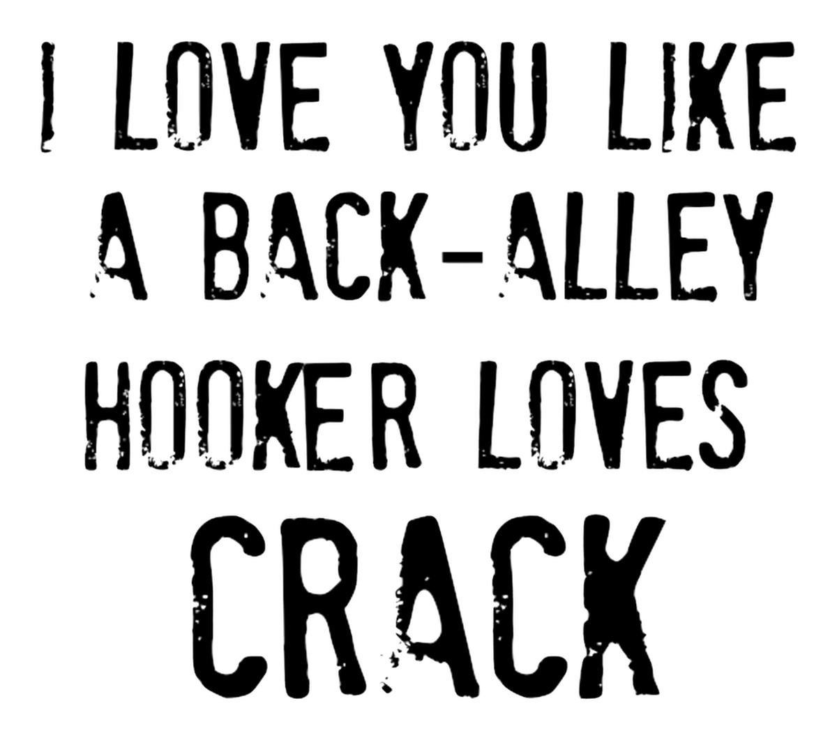 Highlights • Ships from Washington! Shorter shipping distances are kinder to the planet • Free shipping Materials: eco solvent ink, premium outdoor grade vinyl This is for one (1) 4 x 3.54 inch die cut vinyl waterproof sticker. Sticker decal of a black-and-white grunge photo of a sign that reads "I love you like a back alley hooker loves crack". The background is mostly white with some black areas and text. The style is reminiscent of a distressed, unkempt surface with an overlaid message. Sticker decal is indoor and outdoor (UV) safe. These high quality decal stickers are thick and durable and can be used many ways and on many items such as car windows, walls, lockers, tumblers, wine glasses, notebooks, planners, mirrors, cellphone cases, and more. Makes a great gift! Funny waterproof sticker - weatherproof bumper sticker - vinyl decal