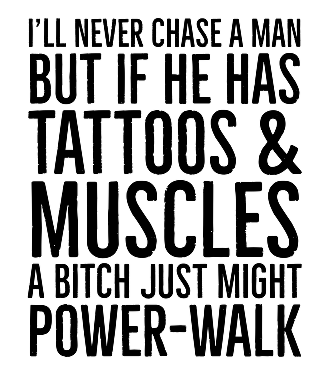Highlights • Ships from Washington! Shorter shipping distances are kinder to the planet • Free shipping Materials: eco solvent ink, premium outdoor grade vinyl This is for one (1) 3.5 x 4 inch die cut vinyl waterproof sticker. Sticker decal featuring a black and white text on a beige background that says, "I'll never chase a man that has tattoos & muscles but might power-walk a bitch just cause I'm not into it. Sticker decal is indoor and outdoor (UV) safe. These high quality decal stickers are thick and durable and can be used many ways and on many items such as car windows, walls, lockers, tumblers, wine glasses, notebooks, planners, mirrors, cellphone cases, and more. Makes a great gift! Funny waterproof sticker - weatherproof bumper sticker - vinyl decal