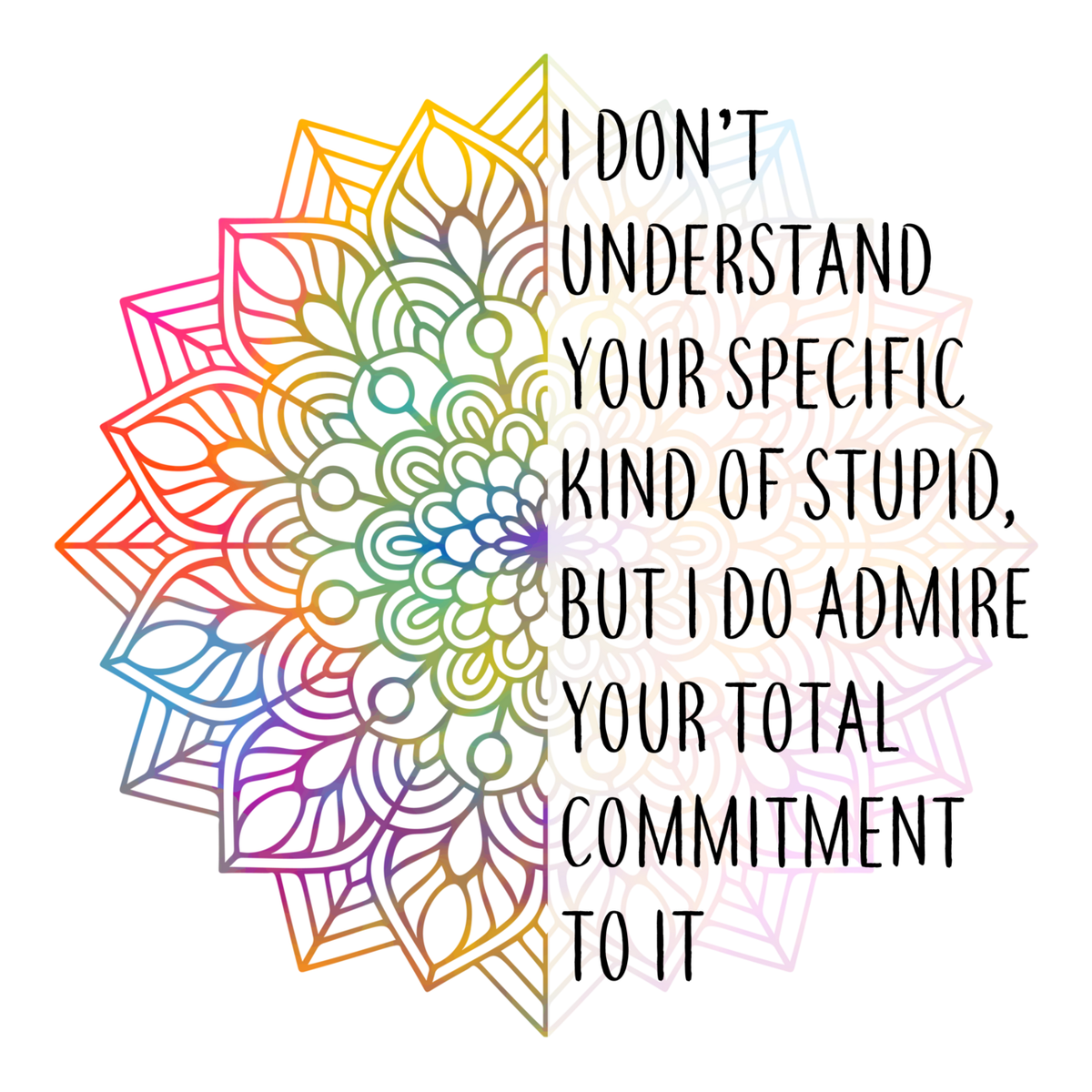 Highlights • Ships from Washington! Shorter shipping distances are kinder to the planet • Free shipping Materials: eco solvent ink, premium outdoor grade vinyl This is for one (1) 4 x 4 inch die cut vinyl waterproof sticker. Sticker decal of a colorful mandala design featuring a whimsical pattern with a quote written on it: "I don't understand why you would do this to me, but I do admire your total commitment to it. Sticker decal is indoor and outdoor (UV) safe. These high quality decal stickers are thick and durable and can be used many ways and on many items such as car windows, walls, lockers, tumblers, wine glasses, notebooks, planners, mirrors, cellphone cases, and more. Makes a great gift! Funny waterproof sticker - weatherproof bumper sticker - vinyl decal