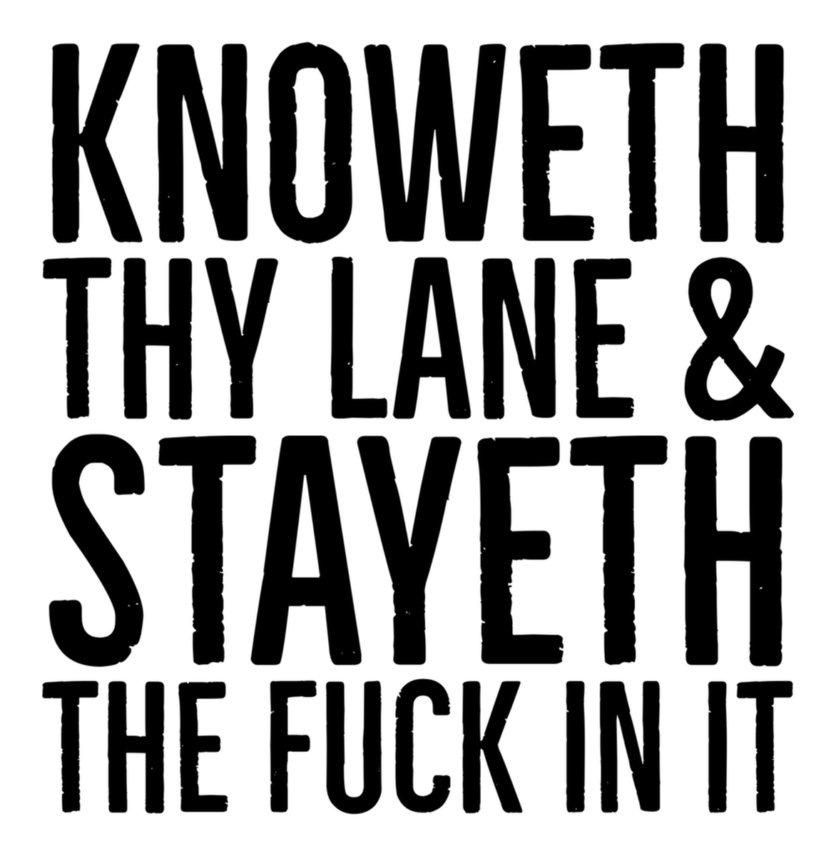 Highlights • Ships from Washington! Shorter shipping distances are kinder to the planet • Free shipping Materials: eco solvent ink, premium outdoor grade vinyl This is for one (1) 3.91 x 4 inch die cut vinyl waterproof sticker. Sticker decal featuring a black & white text banner quoting 'knoweth thy lane and stayeth in it stay in thine own lane stay in thine own lane stayeth in it' over a solid black background. Sticker decal is indoor and outdoor (UV) safe. These high quality decal stickers are thick and durable and can be used many ways and on many items such as car windows, walls, lockers, tumblers, wine glasses, notebooks, planners, mirrors, cellphone cases, and more. Makes a great gift! Funny waterproof sticker - weatherproof bumper sticker - vinyl decal
