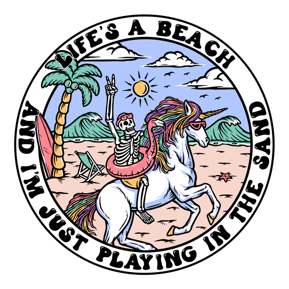 Highlights • Ships from Washington! Shorter shipping distances are kinder to the planet • Free shipping Materials: eco solvent ink, premium outdoor grade vinyl This is for one (1) 4 x 4 inch die cut vinyl waterproof sticker. Sticker decal with a colorful tropical beach scene, featuring a unicorn, palm tree, sand and sea, with two phrases in bold text: "life's a beach" at top and "playing just playing in it" at bottom. Sticker decal is indoor and outdoor (UV) safe. These high quality decal stickers are thick and durable and can be used many ways and on many items such as car windows, walls, lockers, tumblers, wine glasses, notebooks, planners, mirrors, cellphone cases, and more. Makes a great gift! Funny waterproof sticker - weatherproof bumper sticker - vinyl decal