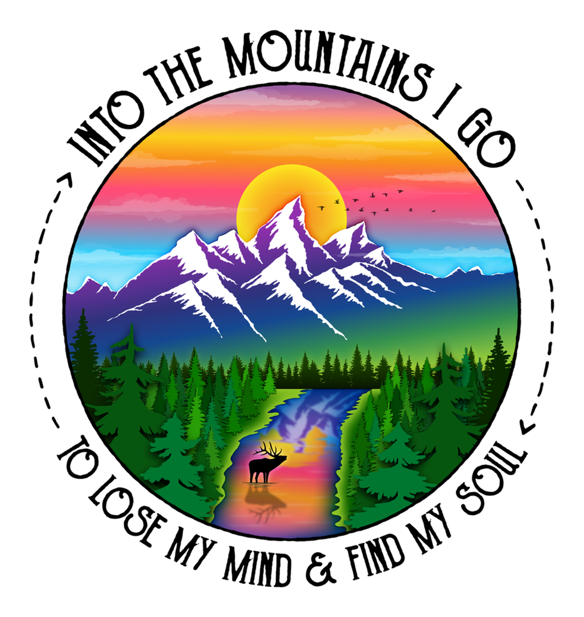 Highlights • Ships from Washington! Shorter shipping distances are kinder to the planet • Free shipping Materials: eco solvent ink, premium outdoor grade vinyl This is for one (1) 3.79 x 4 inch die cut vinyl waterproof sticker. Sticker decal: The artwork is a circular graphic featuring a scenic view of mountains with a road leading into them. It depicts an illustration of a sunset or sunrise, showing hues of orange, yellow, and purple with a silhouette of trees on either side. In the center, there's text that reads "Into the Mountains I go to lose my mind & find my soul." The style is vibrant and reminiscent of nature themes, with text adding a personal touch. Sticker decal is indoor and outdoor (UV) safe. These high quality decal stickers are thick and durable and can be used many ways and on many items such as car windows, walls, lockers, tumblers, wine glasses, notebooks, planners, mirrors, cellphone cases, and more. Makes a great gift! Funny waterproof sticker - weatherproof bumper sticker - vinyl decal