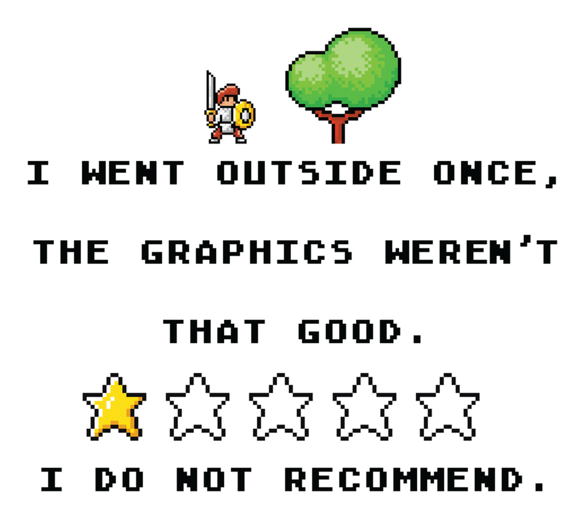 Highlights • Ships from Washington! Shorter shipping distances are kinder to the planet • Free shipping Materials: eco solvent ink, premium outdoor grade vinyl This is for one (1) 4 x 3.55 inch die cut vinyl waterproof sticker. Sticker decal: A nostalgic 8-bit video game scene featuring a character in armor standing beside a tree, saying "I went outside once, the graphics weren't good enough that I do not recommend. Sticker decal is indoor and outdoor (UV) safe. These high quality decal stickers are thick and durable and can be used many ways and on many items such as car windows, walls, lockers, tumblers, wine glasses, notebooks, planners, mirrors, cellphone cases, and more. Makes a great gift! Funny waterproof sticker - weatherproof bumper sticker - vinyl decal
