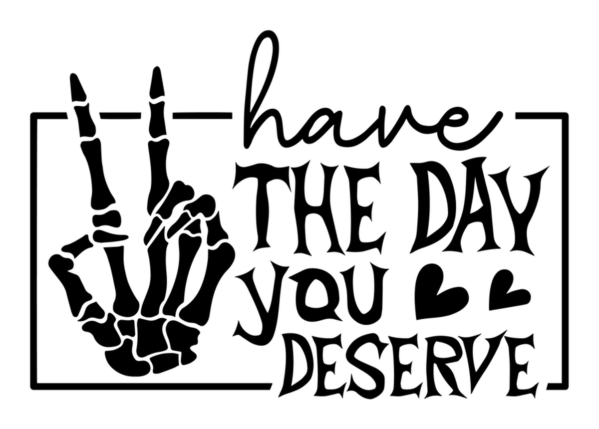 Highlights • Ships from Washington! Shorter shipping distances are kinder to the planet • Free shipping Materials: eco solvent ink, premium outdoor grade vinyl This is for one (1) 4 x 2.87 inch die cut vinyl waterproof sticker. Sticker decal featuring a zombie hand with peace sign above and text "HAVE THE DAY YOU DESERVE" in an ornate, distressed font at bottom. Sticker decal is indoor and outdoor (UV) safe. These high quality decal stickers are thick and durable and can be used many ways and on many items such as car windows, walls, lockers, tumblers, wine glasses, notebooks, planners, mirrors, cellphone cases, and more. Makes a great gift! Funny waterproof sticker - weatherproof bumper sticker - vinyl decal