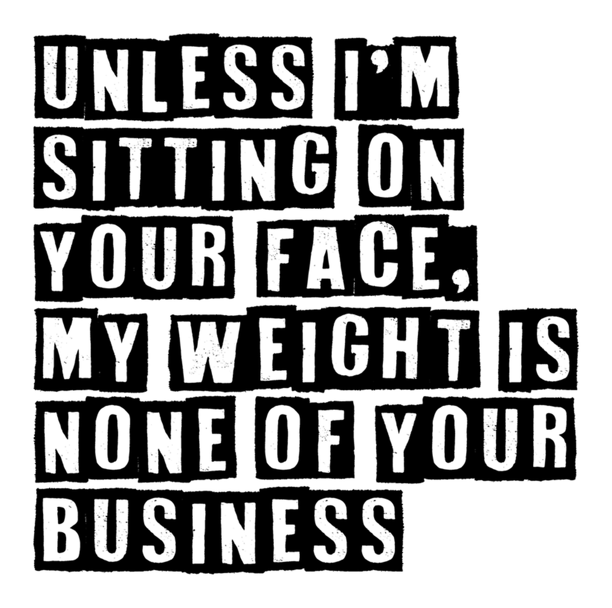 Highlights • Ships from Washington! Shorter shipping distances are kinder to the planet • Free shipping Materials: eco solvent ink, premium outdoor grade vinyl This is for one (1) 4 x 3.98 inch die cut vinyl waterproof sticker. Sticker decal: A black and white sticker featuring a gritty street art-style quote about a girlfriend saying she wants to sit on her boyfriend's face, my weight is none of your business. Sticker decal is indoor and outdoor (UV) safe. These high quality decal stickers are thick and durable and can be used many ways and on many items such as car windows, walls, lockers, tumblers, wine glasses, notebooks, planners, mirrors, cellphone cases, and more. Makes a great gift! Funny waterproof sticker - weatherproof bumper sticker - vinyl decal