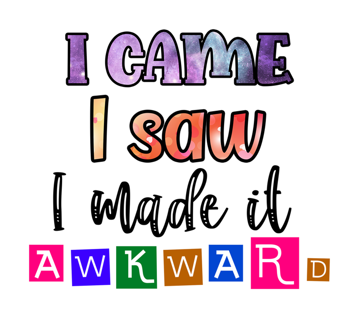 Highlights • Ships from Washington! Shorter shipping distances are kinder to the planet • Free shipping Materials: eco solvent ink, premium outdoor grade vinyl This is for one (1) 4 x 3.54 inch die cut vinyl waterproof sticker. Sticker decal of a quote on Instagram that says "I came, I saw, I made it." in colorful letters with colorful background. The text is arranged in three lines, and the colors are vibrant. The design is playful and artistic, reflecting the energy of the quote. Sticker decal is indoor and outdoor (UV) safe. These high quality decal stickers are thick and durable and can be used many ways and on many items such as car windows, walls, lockers, tumblers, wine glasses, notebooks, planners, mirrors, cellphone cases, and more. Makes a great gift! Funny waterproof sticker - weatherproof bumper sticker - vinyl decal