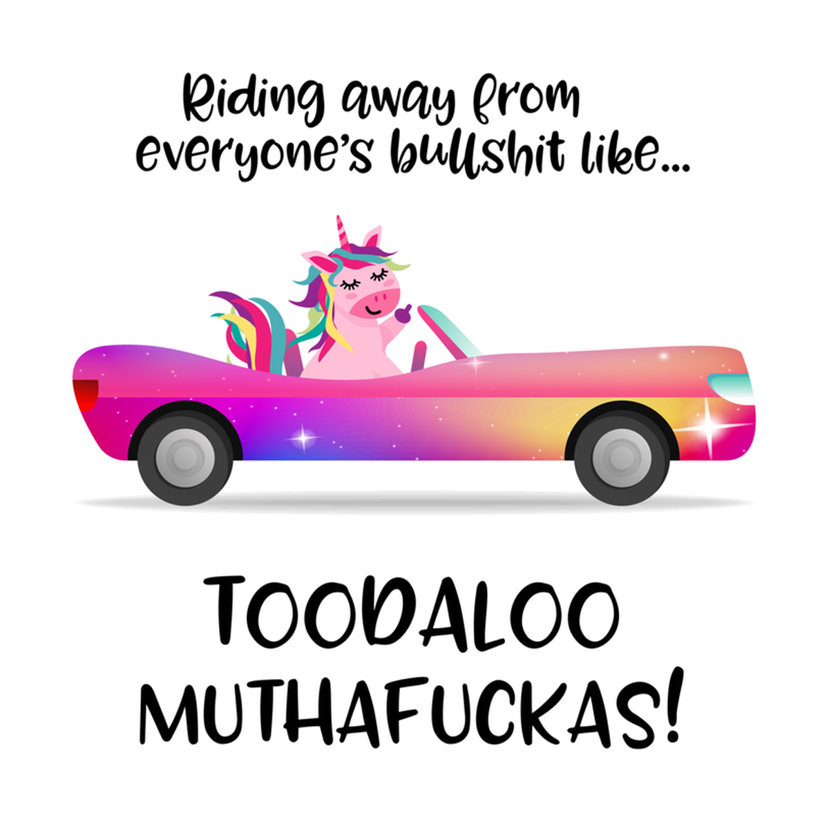 Highlights • Ships from Washington! Shorter shipping distances are kinder to the planet • Free shipping Materials: eco solvent ink, premium outdoor grade vinyl This is for one (1) 4 x 3.97 inch die cut vinyl waterproof sticker. Sticker decal: Two cartoon unicorns drive a rainbow car on road, with one holding a steering wheel and other sitting back. The car is decorated with glittery sparkles and rainbow stripes. Above them, text reads, "Riding away from everyone's bullshit like..." Below the image, another line of text says, "TOOTALLOO MUFKA." The sticker features a playful, colorful, cartoonish style with glossy finishes and bold colors. Sticker decal is indoor and outdoor (UV) safe. These high quality decal stickers are thick and durable and can be used many ways and on many items such as car windows, walls, lockers, tumblers, wine glasses, notebooks, planners, mirrors, cellphone cases, and more. Makes a great gift! Funny waterproof sticker - weatherproof bumper sticker - vinyl decal