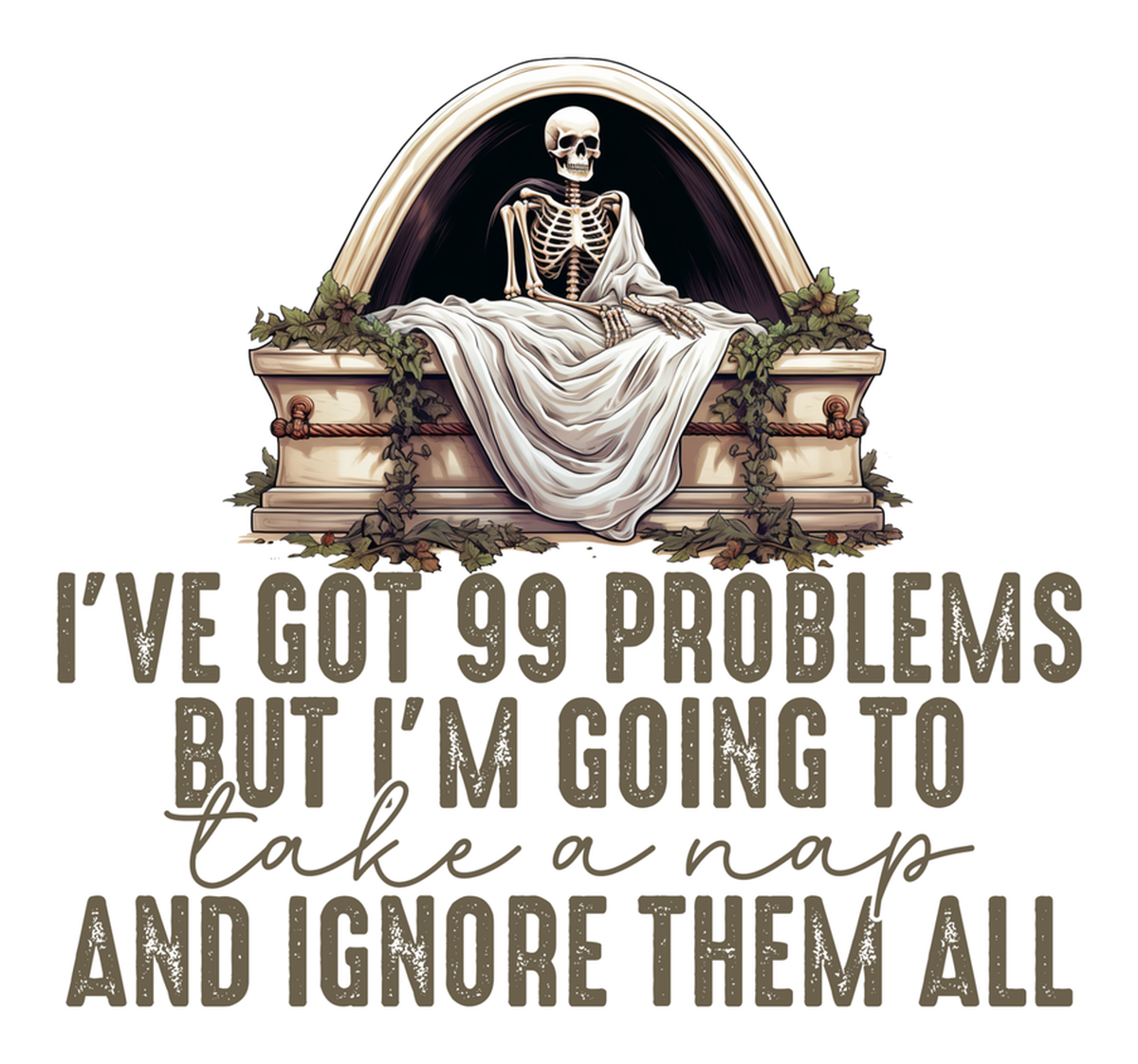 Highlights • Ships from Washington! Shorter shipping distances are kinder to the planet • Free shipping Materials: eco solvent ink, premium outdoor grade vinyl This is for one (1) 4 x 3.74 inch die cut vinyl waterproof sticker. Sticker decal of a skeleton sitting on a bed overlaid text "I've got 99 problems but I'm taking a nap and ignoring them all" in a black cursive font against a white background. Sticker decal is indoor and outdoor (UV) safe. These high quality decal stickers are thick and durable and can be used many ways and on many items such as car windows, walls, lockers, tumblers, wine glasses, notebooks, planners, mirrors, cellphone cases, and more. Makes a great gift! Funny waterproof sticker - weatherproof bumper sticker - vinyl decal