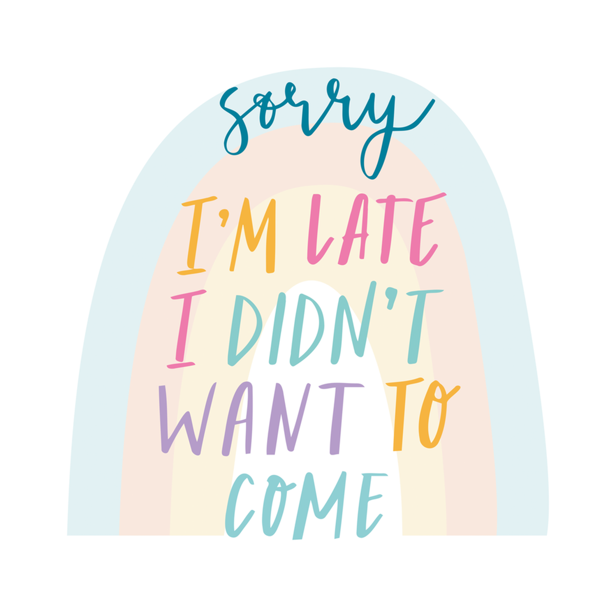 Highlights • Ships from Washington! Shorter shipping distances are kinder to the planet • Free shipping Materials: eco solvent ink, premium outdoor grade vinyl This is for one (1) 4 x 3.94 inch die cut vinyl waterproof sticker. Sticker decal of a rainbow sign with text that reads "Sorry I'm late I didn't want to come". The sticker uses bright pastel colors, and it has a playful and welcoming vibe. Sticker decal is indoor and outdoor (UV) safe. These high quality decal stickers are thick and durable and can be used many ways and on many items such as car windows, walls, lockers, tumblers, wine glasses, notebooks, planners, mirrors, cellphone cases, and more. Makes a great gift! Funny waterproof sticker - weatherproof bumper sticker - vinyl decal