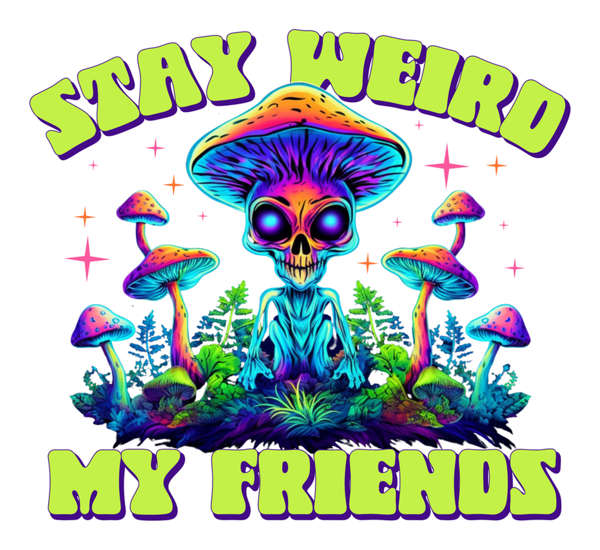 Highlights • Ships from Washington! Shorter shipping distances are kinder to the planet • Free shipping Materials: eco solvent ink, premium outdoor grade vinyl This is for one (1) 4 x 3.67 inch die cut vinyl waterproof sticker. Sticker decal: A vibrant sticker featuring an illustrated mushroom, a cartoon skull, and rainbow colors. Text includes "STAY WEIRD," "MY FRIENDS," and a purple mushroom graphic. Sticker decal is indoor and outdoor (UV) safe. These high quality decal stickers are thick and durable and can be used many ways and on many items such as car windows, walls, lockers, tumblers, wine glasses, notebooks, planners, mirrors, cellphone cases, and more. Makes a great gift! Funny waterproof sticker - weatherproof bumper sticker - vinyl decal