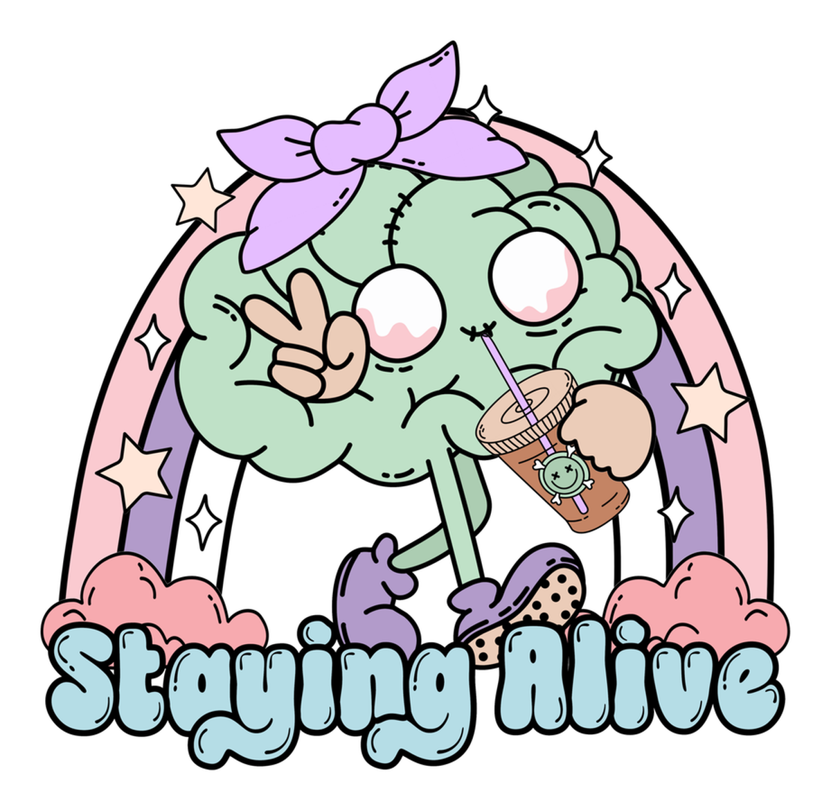 Highlights • Ships from Washington! Shorter shipping distances are kinder to the planet • Free shipping Materials: eco solvent ink, premium outdoor grade vinyl This is for one (1) 4 x 3.9 inch die cut vinyl waterproof sticker. Sticker decal features a whimsical cartoon character of a cloud-like creature enjoying a cup of coffee, holding up a peace sign while standing on a rainbow. The sticker has text that reads "Staying alive" at the bottom. Sticker decal is indoor and outdoor (UV) safe. These high quality decal stickers are thick and durable and can be used many ways and on many items such as car windows, walls, lockers, tumblers, wine glasses, notebooks, planners, mirrors, cellphone cases, and more. Makes a great gift! Funny waterproof sticker - weatherproof bumper sticker - vinyl decal