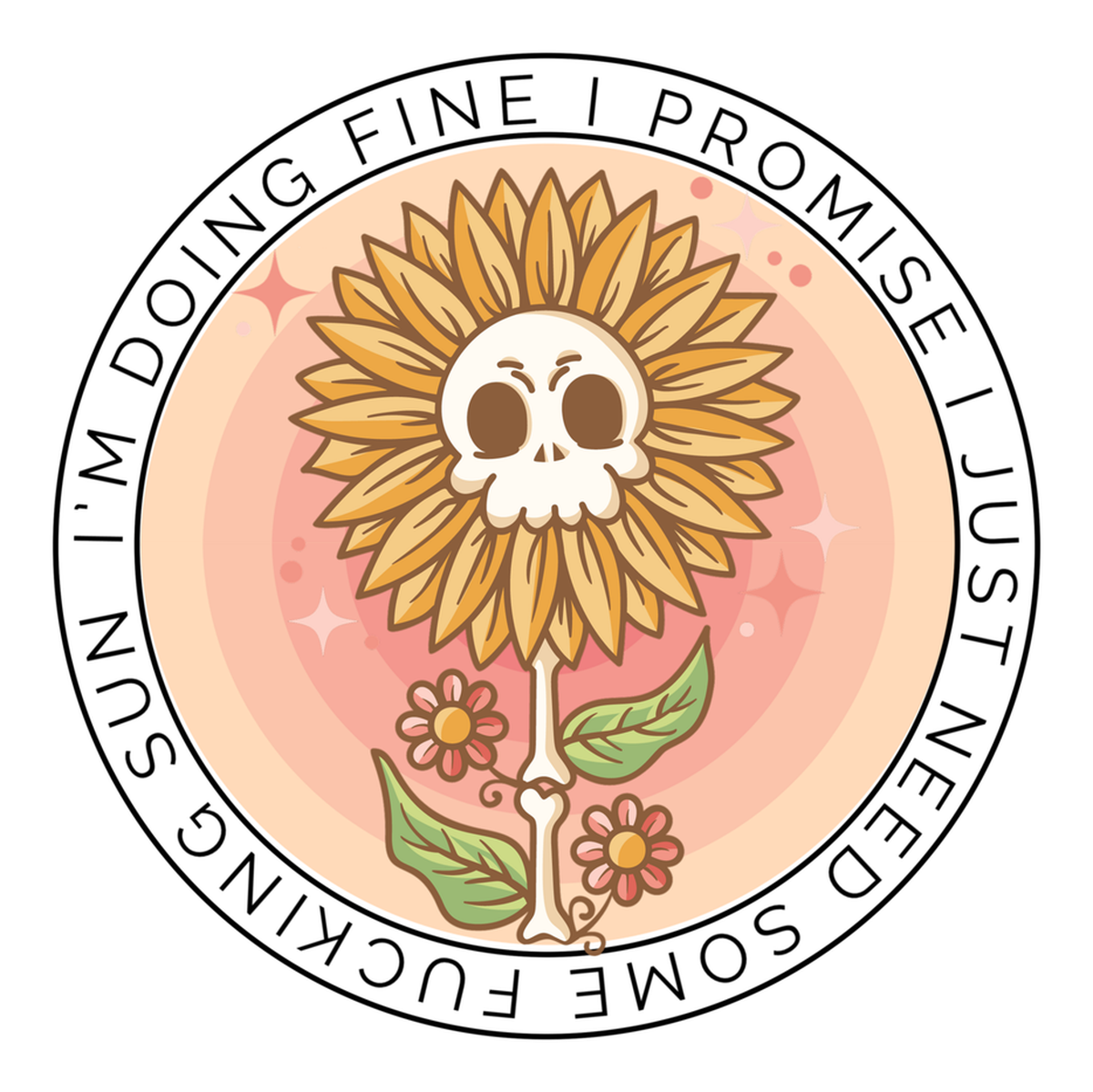 Highlights • Ships from Washington! Shorter shipping distances are kinder to the planet • Free shipping Materials: eco solvent ink, premium outdoor grade vinyl This is for one (1) 4 x 4 inch die cut vinyl waterproof sticker. Sticker decal of a sunflower with a skull inside, featuring a phrase that says "doing fine i promise just doing my best, i love u & u love me we're gonna get through this just fine & i need you". Sticker decal is indoor and outdoor (UV) safe. These high quality decal stickers are thick and durable and can be used many ways and on many items such as car windows, walls, lockers, tumblers, wine glasses, notebooks, planners, mirrors, cellphone cases, and more. Makes a great gift! Funny waterproof sticker - weatherproof bumper sticker - vinyl decal